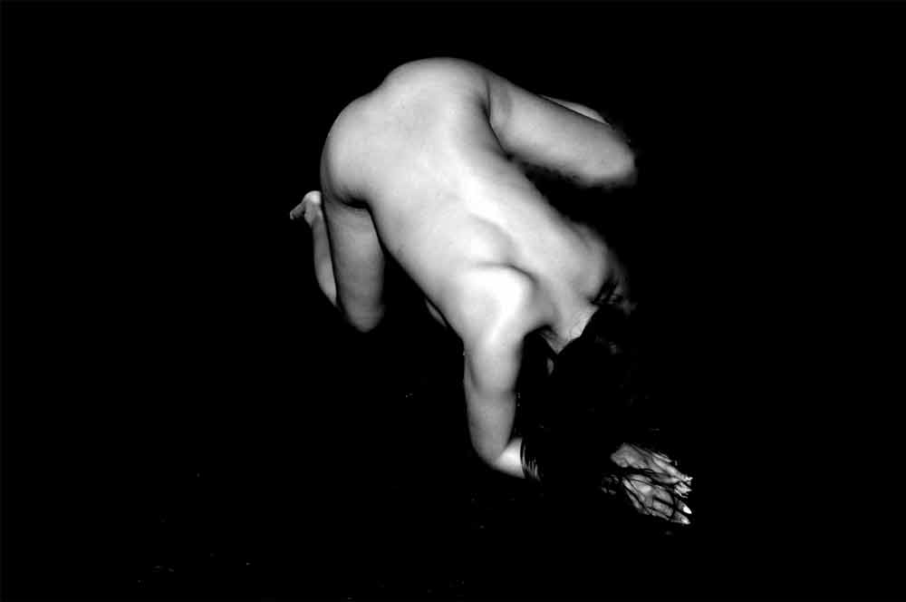 „Geborgen im Dunkel“ zeigt den Moment völliger Hingabe – eine Verschmelzung von Körper, Raum und Emotion. Der Akt wird zur abstrakten Form, das Licht zeichnet nur Konturen, der Rest bleibt der Imagination überlassen.